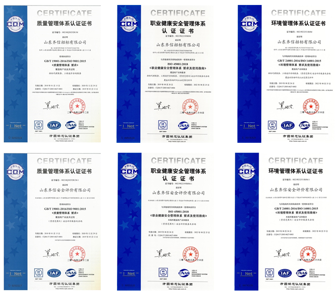2019年8月,伴隨著公司“質量月”活動,在公司領導的大力支持以及各部門的積極配合下,公司在原有的質量體系基礎上,又新增申請了環境管理體系和職業健康安全管理體系認證,并順利通過此次認證,目前山東齊信招標有限公司及山東齊信安全評價有限公司均已具備ISO三大體系認證證書。