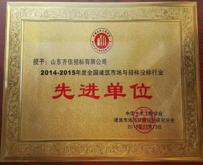 2015年,11月13日,在中國土木工程學會建筑市場與招投標研究分會開展的2014-2015年度“全國建筑市場與招標投標先進單位”評選活動中,經各省、自治區、直轄市相關部門評選推薦并報中國土木工程學會建筑市場與招標投標研究分會評審,山東齊信招標有限公司被評為“先進單位”稱號。