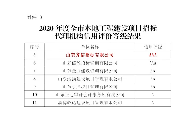 2021年5月,淄博市住建局發布《關于2020年度淄博市房地產開發企業等信用評價等級結果的通報》,齊信被評為淄博市工程建設項目招標代理機構AAA級信用企業,列入行業誠信“紅名單”。