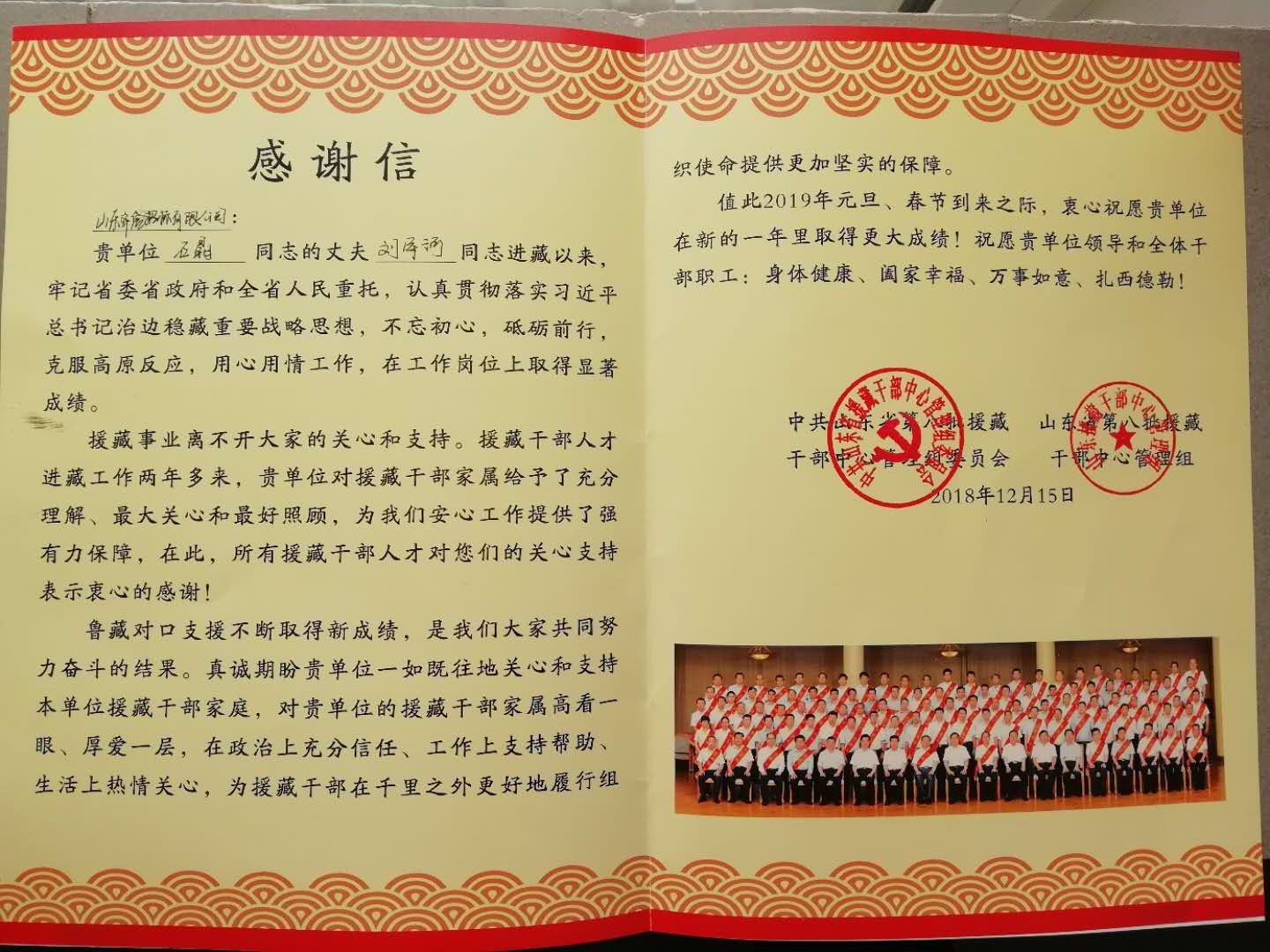 2019年元旦來臨之際,公司收到一封來自中共山東省第八批援藏干部中心管理組委員會的感謝信,信中對咨詢服務(wù)事業(yè)部經(jīng)理石晶的丈夫劉軍河同志在魯藏對口支援工作中的辛勤付出給予高度評價與稱贊,對石晶及公司積極支持、關(guān)心援藏事業(yè)表達衷心的感謝,字里行間涌動著濃濃的情誼與祝福。